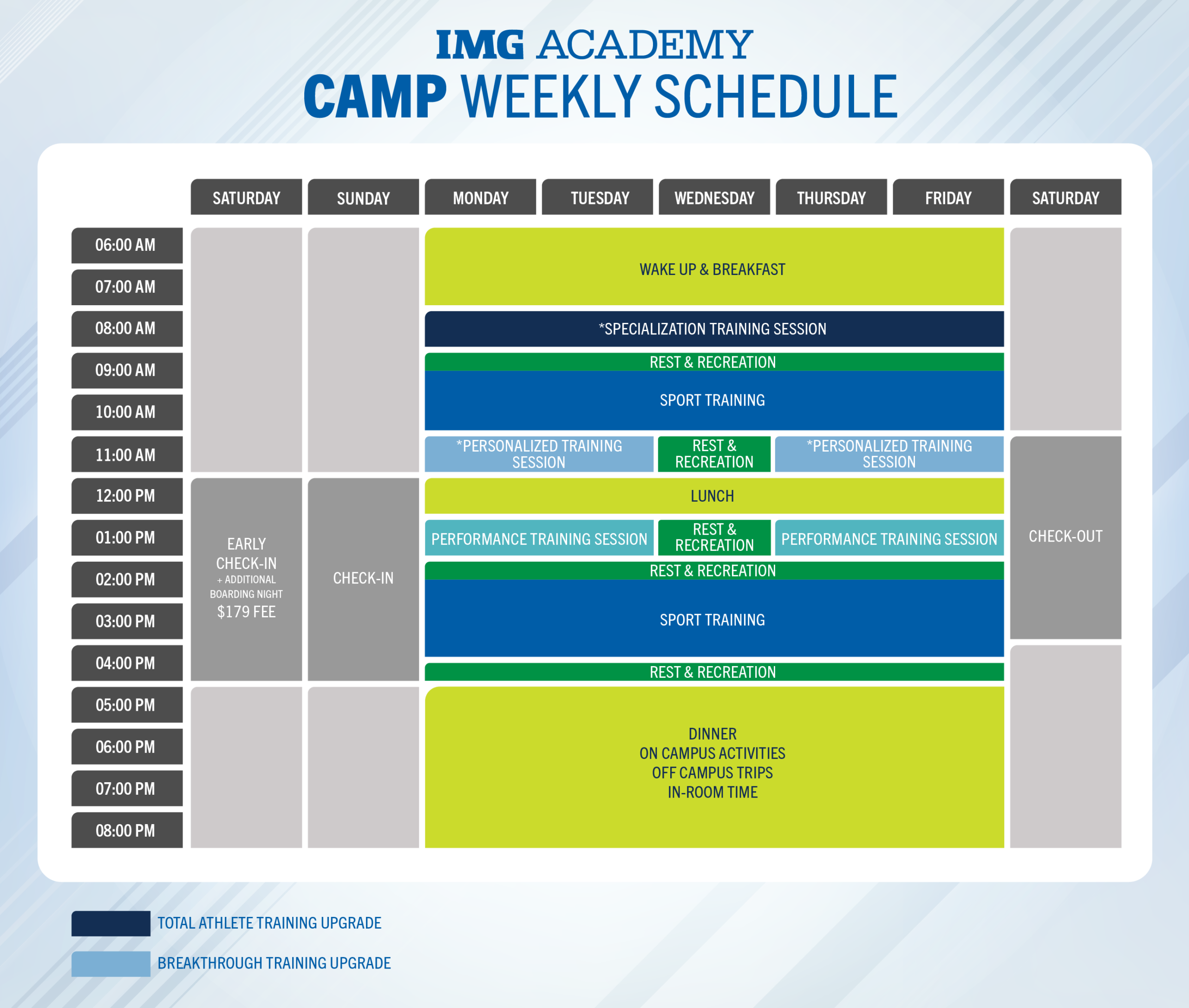 O IMG Camp (programa padrão) é a base de todos os outros formatos e concentra-se no treinamento técnico e tático da modalidade escolhida. Já os programas Total Athlete e Game Changer incluem, além do treino esportivo, sessões semanais específicas chamadas “Specializations”, que podem ser alteradas a cada semana do camp. Essas especializações aprofundam áreas como desempenho mental, velocidade, força, liderança e inteligência de jogo, oferecendo um diferencial competitivo importante. Para os atletas que desejam maximizar seu potencial competitivo, a opção Breakthrough proporciona uma experiência ainda mais intensa e personalizada, com foco elevado em performance e desenvolvimento avançado.