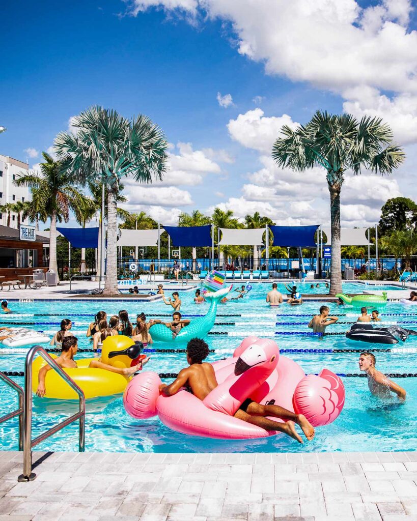 Entre as sessões de treino, os alunos contam com uma completa área de lazer, que inclui piscina estilo resort com salva-vidas, quadras de vôlei de areia e basquete, campo poliesportivo de grama sintética, mesa de pingue-pongue e diversas atividades organizadas, como noites de cinema na piscina, pool parties e programações no Centro Estudantil.