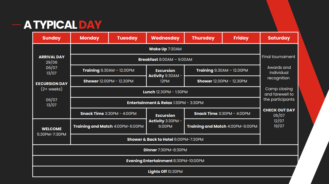 Realizado em inglês, o camp garante uma mistura perfeita de paixão pelo futebol, camaradagem global e programas que valorizam igualmente talentos masculinos e femininos, em um ambiente respeitoso e inclusivo para o crescimento.