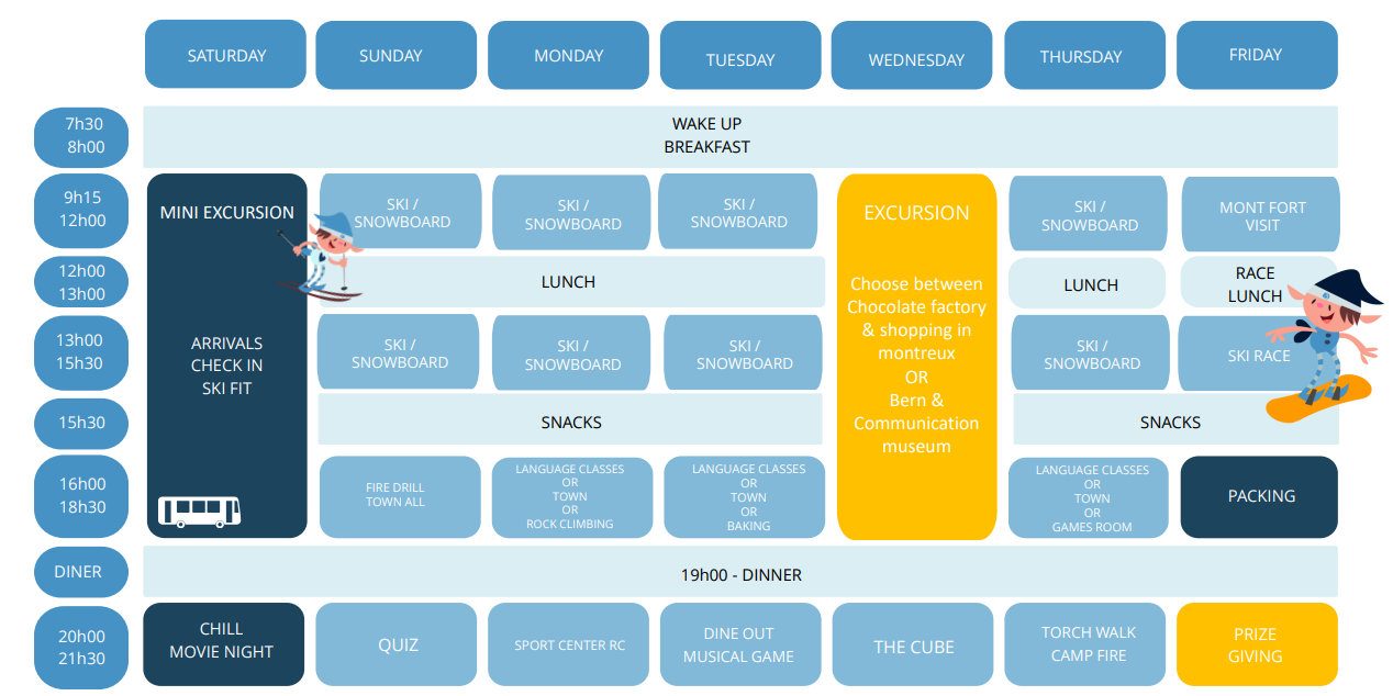 Além das aulas de esqui e snowboard em período integral, o camp oferece uma programação completa de atividades après-ski e noturnas. Os participantes podem escolher entre diversas experiências típicas de inverno, como trenó, construção de iglus, caminhadas com tochas, discoteca, patinação no gelo, hóquei, criação de bonecos de neve e muito mais — garantindo diversão e integração do início ao fim do dia.